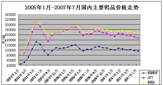 同期比較,鎢品出口價(jià)格延續(xù)了2006年的平穩(wěn)態(tài)勢,綜合平均價(jià)格一直在3萬美元/噸金屬以上小幅波動,并且穩(wěn)中略有上升。鎢材、硬質(zhì)合金混合料、鎢酸鈉和鎢絲的出口價(jià)格分別比去年上升83.11%、2.59%、4.51%和1.82%,其他鎢品價(jià)格略有下降。(見主要鎢品月平均價(jià)格和月綜合平均價(jià)格走勢圖)