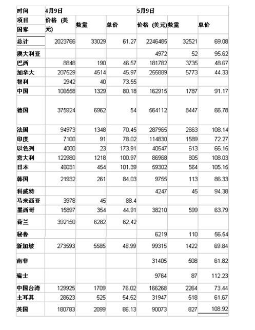09年4、5月份美國鎢粉出口量值統(tǒng)計