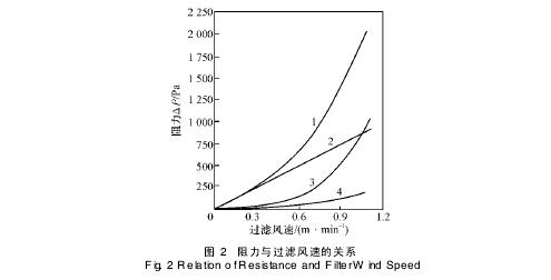 過濾器過濾微粒后,其上沉積有粉塵,從而產(chǎn)生附加的阻力,其阻力大小與微粒的厚度與性質(zhì)有關(guān),如圖2中曲線3所示。