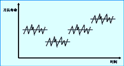從刀具壽命隨時間變動的示意圖可見(圖2),刀具壽命原來在某個平均值附近發(fā)生上下波動,引起這種微小波動的原因是系統(tǒng)普通原因,但是如果一段時間後刀具壽命突然變短或變長,這就必然存在某種特殊原因。