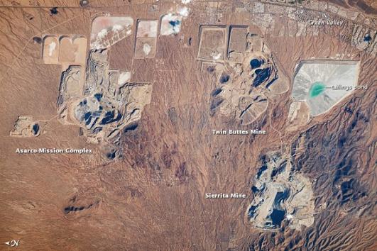銅的導(dǎo)電和導(dǎo)熱性能良好,幾乎所有的現(xiàn)代電子設(shè)備都會用到這一重要元素。亞利桑那州是美國最大的銅礦石開采地,并且以開采斑巖銅礦沉積層為主。從斑巖銅礦沉積層中提取富含金屬的礦石最常用的方法,就是露天開采。當(dāng)然,露天開采事實(shí)上也包括部分地下開采活動。 這張由宇航員所拍攝的圖片上所顯示的是位于亞利桑那州綠谷鎮(zhèn)西北偏西方向的三個露天礦場。雖然這三個礦場似乎離得很近,但是每個礦場都開采出了獨(dú)立的斑巖銅礦。當(dāng)含有豐富晶體的巖漿向上運(yùn)動并穿過原本存在的巖層時,便形成了斑巖銅礦沉積層。隨著巖漿冷卻并結(jié)晶,于是形成了一種帶有大晶體的火成巖,由于具有精細(xì)的紋理狀結(jié)構(gòu),因此俗稱斑巖。熱流體循環(huán)通過巖漿和周圍的巖層,沉積下來形成了富含銅的礦物質(zhì)和其它具有空間特征的礦物質(zhì)。對于地質(zhì)學(xué)家來說,這些礦物質(zhì)標(biāo)志了其自身礦體的性質(zhì)。 這些礦場是可以識別的:工作臺的同心線將礦場劃分為兩個部分。這些工作臺能夠讓設(shè)備和人員接觸到礦坑底部暴露出來的新礦石(圖中灰色部分)。在備用的礦坑底部也可能積聚成水池,例如在圖片中雙巴特斯礦場的右上角(黑色區(qū)域)。這些露天礦場周圍是一些尾料礦池和礦石殘渣傾倒區(qū);這些回收的礦物廢料被儲存起來,然后將其過濾并進(jìn)一步煉造出其他金屬。礦石殘渣傾倒區(qū)的水呈現(xiàn)出綠色(見圖的右側(cè)),這可能是過濾出的金屬所導(dǎo)致的。 在圖片的左側(cè)是阿薩羅庫任務(wù)復(fù)合礦場。阿薩羅庫任務(wù)復(fù)合礦場目前仍在生產(chǎn),產(chǎn)品以銅和鉬(煉鋼和冶煉其他合金中的重要材料)為主。2008年,該礦場每天大約處理53700噸礦石。雙巴特斯礦場(圖片右上角)亦是銅和鉬的重要生產(chǎn)地,曾于1994年關(guān)閉,但最近被一家公司(Freeport-McMoRan銅金公司)收購,并有可能重新開放。謝里塔礦場(圖片右下角),亦屬于Freeport-McMoRan銅金公司,它主要生產(chǎn)銅、鉬,以及稀有金屬錸。錸是用來制造用于噴氣發(fā)動機(jī)部件的耐高溫合金以及高辛烷值無鉛汽油。2007年,該礦場每天大約能處理11.5萬噸礦石。 這張編號為ISS022-E-26137的圖片攝于2010年1月14日,所采用的相機(jī)是尼康D3數(shù)碼相機(jī)。圖片由國際空間站第22遠(yuǎn)征隊宇航員所拍攝,由約翰遜航天中心的國際空間站地球觀測實(shí)驗(yàn)和圖像科學(xué)與分析實(shí)驗(yàn)室所提供。圖像已經(jīng)經(jīng)過處理,以提高對比度。國際空間站非常支持實(shí)驗(yàn)室?guī)椭詈絾T拍攝地球照片,他們認(rèn)為這對于科學(xué)家和公眾來說極具價值。
