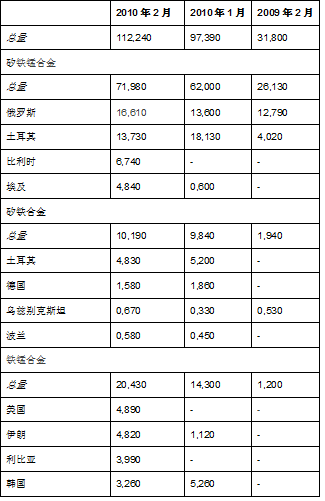 同時(shí)和2009年2月相比,國(guó)家2010年2月鐵合金進(jìn)口增加了9.2%,包括矽鐵錳合金增加41.9%,但是鐵錳和矽鐵合金進(jìn)口分別降低18.7%和38.9%。