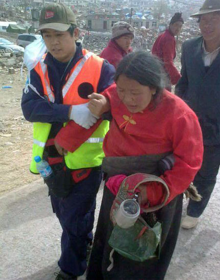 遠山發(fā)回短息說:“今天有不少志愿者主動加入我們,展開救援救助,有當(dāng)?shù)氐尼t(yī)生和司機,幫助我們解決語言溝通問題。這些人都是家在玉樹的,房子倒了,可是這三天里一直在做志愿者自救互救,感謝�!�
