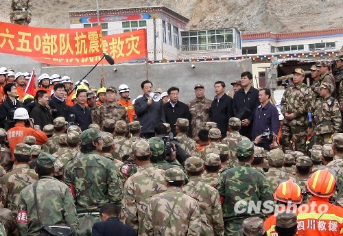 在受災(zāi)嚴(yán)重的扎西科村,胡錦濤走到正在清理廢墟的部隊官兵和公安民警中間,向大家表示誠摯的慰問。中新社發(fā)劉忠俊 攝
