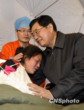 胡錦濤親切看望了醫(yī)療點(diǎn)帳篷內(nèi)的幾名受傷民眾。他表示,中央和政府保證災(zāi)區(qū)群眾有水喝,有飯吃,保證人民群眾的生命和財(cái)產(chǎn)安全,將來(lái)也一定會(huì)做好重建家園的工作。