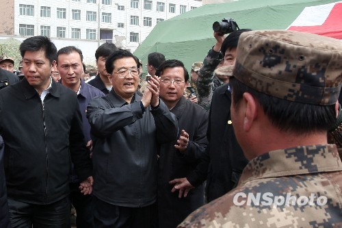4月18日,中共中央總書記、國家主席、中央軍委主席胡錦濤飛抵玉樹,看望慰問地震災(zāi)區(qū)干部群眾,實地指導(dǎo)抗震救災(zāi)工作。中新社發(fā) 盛佳鵬 攝