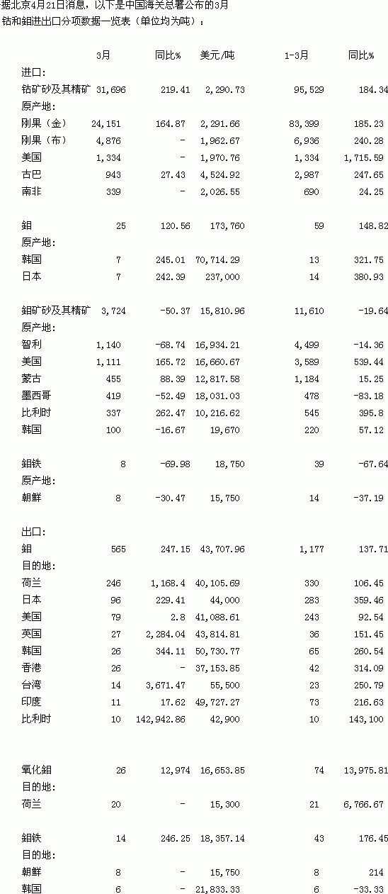 3月份中國(guó)鈷和鉬進(jìn)出口數(shù)據(jù)一覽