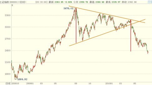 從2009年7月份至 2010年4月份,上證指數(shù)走出了一個巨大的收斂三角形,后隨著國家房地產調控政策的出臺,該三角形選擇向下突破。從形態(tài)學理論上來說,到目前為止上證指 數(shù)基本下跌到位。如圖所示,該三角形上下最大垂直邊距大約為700點,而三角形突破之時上證指數(shù)在3150點左右。按照三角形形態(tài)論,三角形突破后,其突 破幅度應該為三角形的垂直邊距,那么可以估算上證指數(shù)的下跌目標為2450點左右。目前上證指數(shù)剛好是在2400點左右,可以說已經完成了三角形的突破下 跌。前期上證指數(shù)一度在2500點顯示出較強的支撐力度,說明市場在此處有較多買盤進入,但后來農行IPO導致大盤破位下跌,這波下跌明顯帶有非理性和誘 空的味道。整體上看來,股市很可能在2400點下跌到位后開始出現(xiàn)較大級別的反彈。