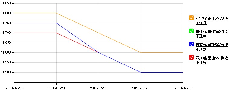本周金屬硅呈現(xiàn)持續(xù)下調(diào)的走勢。截止周末,553#報價為11500-11700元/噸左右,441#報到12200-12400元/噸,3303#報12500-12700元/噸,2202#報13200-13400元/噸,均為含稅到港。