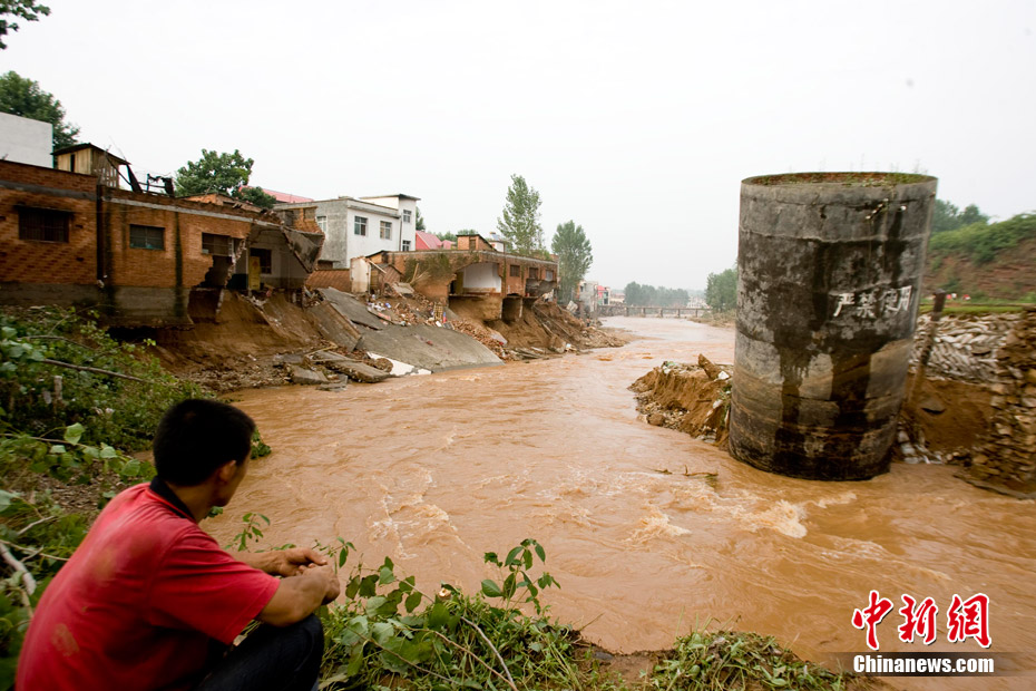 7月23日8時至25日8時,地處中原腹地的河南省遭強降雨襲擊,致使部分地區(qū)房屋倒塌、良田被毀、通訊中斷。河南省防汛抗旱指揮部25日公布的消息稱, 受降雨影響,該省丹江荊紫關(guān)水文站24日15時洪峰水位217.59米,洪峰流量10000立方米每秒,為新中國成立以來最大;老灌河西峽水文站24日 17時30分洪峰水位84.31米,洪峰流量7380立方米每秒,亦為1949年以來最大。伊河陸渾水庫25日8時水庫蓄水位320.77米,超歷史最高 水位1.9米。中新社發(fā)王中舉 攝
