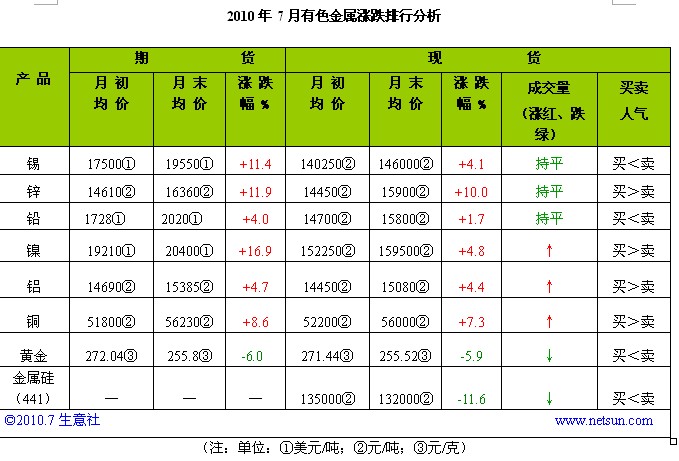 7月的高溫一浪高過一浪,7月的有色市場也開始進(jìn)入伏天,與6月份相比是大相徑庭,上月是綠色環(huán)保型,而本月幾乎所有有色產(chǎn)品全線飄紅,在 短短的一個月之內(nèi),有色市場即由綠轉(zhuǎn)紅,變換了季節(jié)。在生意社重點監(jiān)測的8種產(chǎn)品中(數(shù)據(jù)截止到729日),呈現(xiàn)上漲的有6種產(chǎn)品,下跌的只有黃金和金 屬硅,鎳、鋅、錫高居漲幅榜的前三甲,漲幅均超過10%,而黃金本月的跌幅也創(chuàng)了上半年以來月度變化的最高,達(dá)6%。對比上月的漲跌榜,本月的有色產(chǎn)品漲 跌榜有兩大特點: