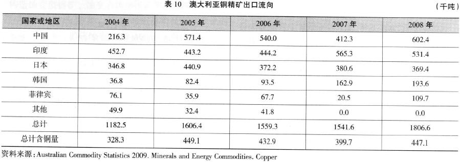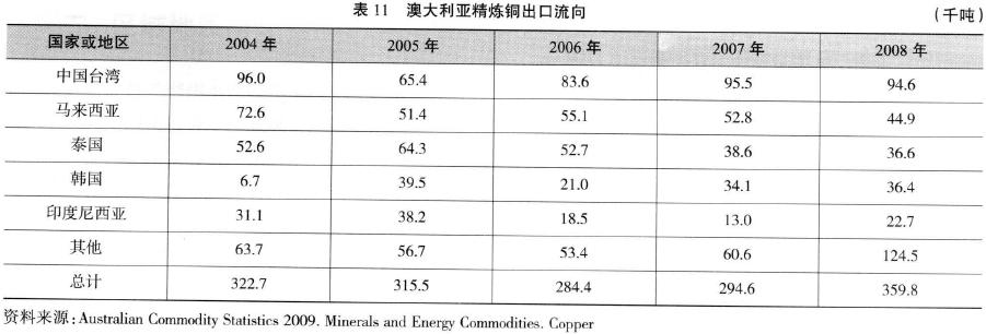 1.出口 澳大利亞國(guó)內(nèi)消費(fèi)的銅僅占其銅產(chǎn)量的三分之一左右,其余可用于出口創(chuàng)匯。10年來(lái)澳大利亞的銅出口量見(jiàn)表8。由表8可見(jiàn),總體上,澳大利亞銅出口量呈現(xiàn)了不斷增長(zhǎng)的態(tài)勢(shì)。其中,礦山產(chǎn)品(銅精礦)和精煉產(chǎn)品(精煉銅)的各自出口量見(jiàn)表9。10年中,澳大利亞銅精礦出口量增長(zhǎng)了47.5%,精煉銅出口量也增長(zhǎng)了40.6%。 2.主要出口市場(chǎng) 進(jìn)人21世紀(jì)以來(lái),澳大利亞銅精礦的主要出口市場(chǎng)有中國(guó)、印度、日本、韓國(guó)、菲律賓等。精煉銅的出口市場(chǎng)主要有中國(guó)臺(tái)灣、馬來(lái)西亞、歐盟、泰國(guó)、韓國(guó)、印度尼西亞等國(guó)家和地區(qū)。近5年澳大利亞銅精礦和精煉銅的出口流向分別如表10和表11所示。由表10可見(jiàn),2005、2006和2008年,中國(guó)是澳大利亞銅精礦第一出口目的地。而由表11可見(jiàn),中國(guó)臺(tái)灣始終是澳大利亞精煉銅最大的出口目的地。