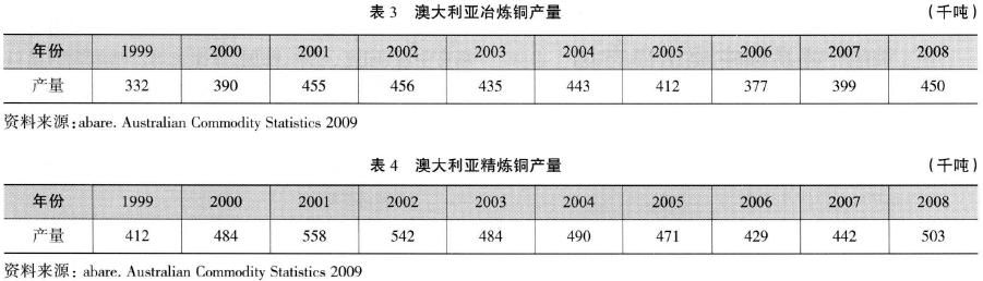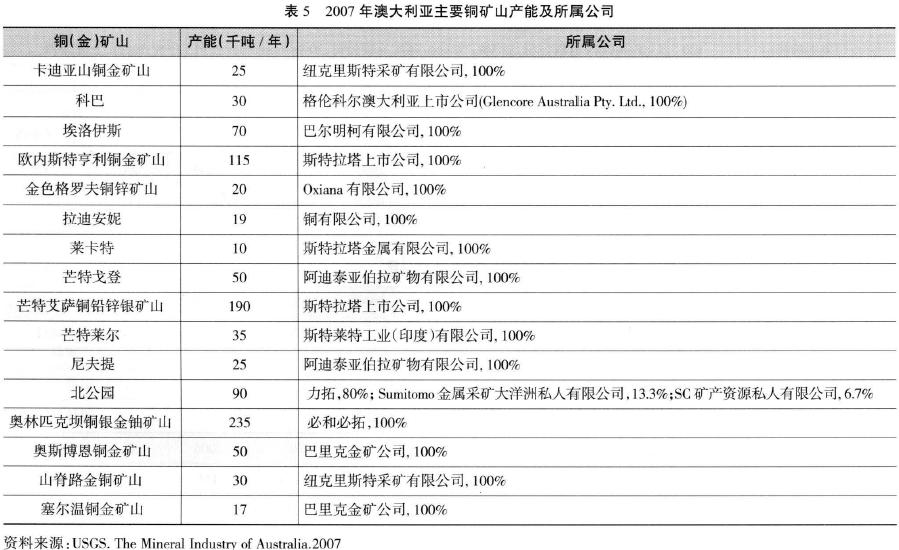 澳大利亞有3座銅冶煉廠和3座銅精煉廠,分別是芒特艾薩銅冶煉廠、奧林匹克壩銅冶煉廠、肯布拉港(Port Kembla)銅冶煉廠、奧林匹克壩銅精煉廠、肯布拉港銅精煉廠和湯斯維爾(Townsville)銅精煉廠。各冶煉廠與精煉廠的產(chǎn)能和所屬公司見(jiàn)表6。