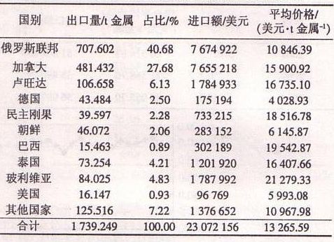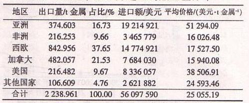 表7 2010年1-6月進(jìn)口鎢精礦地區(qū)分布