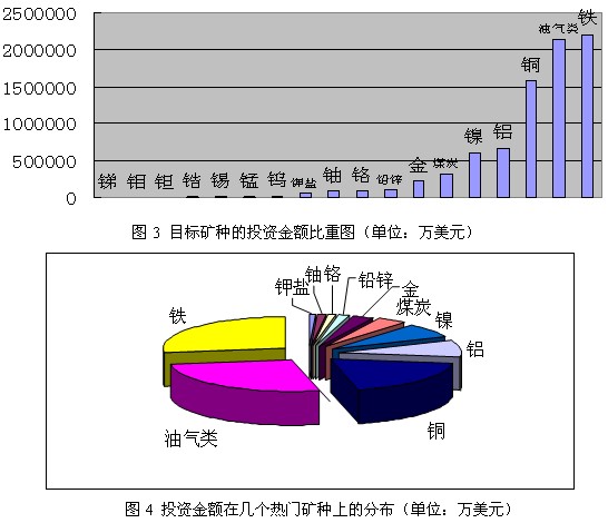 勘查、開采項目以項目的實際勘查開采地點進(jìn)行統(tǒng)計;并購等間接投資以目標(biāo)礦業(yè)企業(yè)的所屬國進(jìn)行統(tǒng)計。若該公司在兩個以上國家設(shè)有總部,則按該公 司的主營礦種總部所在地進(jìn)行統(tǒng)計。如力拓在澳大利亞和英國都有總部,因其公司總資產(chǎn)89%集中在澳大利亞和北美且控股澳大利亞第二大鐵礦石生產(chǎn)公司,主營 礦種是鐵礦,因此將并購該項公司的150多億資金全部計入澳大利亞(注:意向投資均未列入統(tǒng)計)。