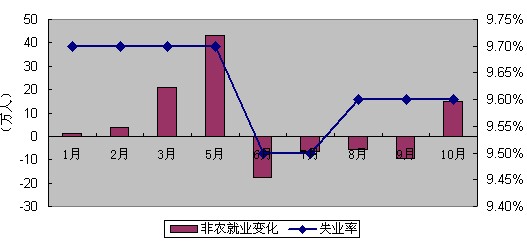 上周五晚,美國勞工部公布10月份非農(nóng)就業(yè)數(shù)據(jù),10月非農(nóng)就業(yè)人口意外增加15.1萬人,遠(yuǎn)高于預(yù)期,其中私營部門就業(yè)人數(shù)增加15.9萬人,預(yù)期增加 7.5萬人,創(chuàng)下今年4月以來最大月度漲幅。但失業(yè)率為9.6%,與預(yù)期持平,為連續(xù)第三個月維持在此高位。單憑此次非農(nóng)數(shù)據(jù)趨好斷言就業(yè)市場好轉(zhuǎn),為時 尚早。在美聯(lián)儲剛公布6000億美元二次量化的背景之下,數(shù)據(jù)對市場影響有限,難以從根本上提振美元。