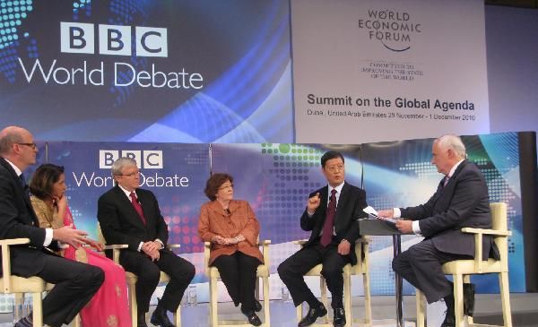 11月30日,在阿聯(lián)酋迪拜,中國(guó)常駐聯(lián)合國(guó)日內(nèi)瓦辦事處大使何亞非(右二)與澳大利亞外長(zhǎng)陸克文(右四)等嘉賓參加英國(guó)廣播公司(BBC)世界辯論欄目“自然資源”專題電視辯論。