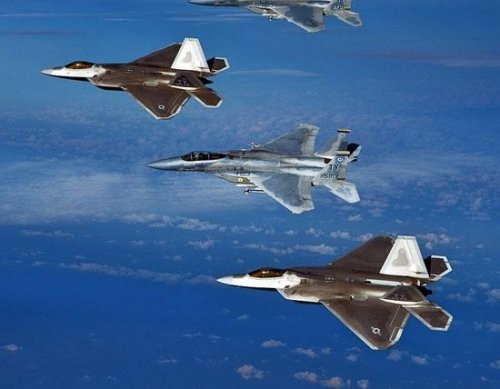 美國空軍F-22A戰(zhàn)機與F-15C戰(zhàn)機編隊巡航