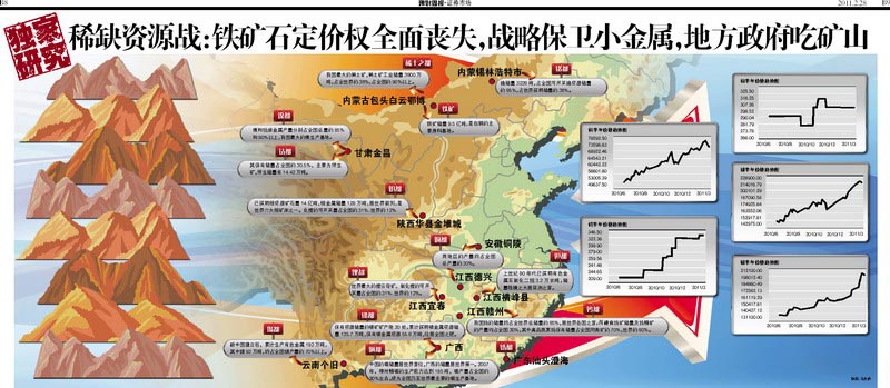稀有金屬從“白菜價”到“中東石油”的爭奪 本期主題涉及到的資源可以分為兩類。一類是我國稀缺的資源,像鐵礦石、鋯這樣的礦產;一類是我國豐富的資源,像稀有金屬以及稀土。 在兩手都要抓的情況下,我們可以看到近期各種關于資源品的新聞、會議和政策的出臺。中國鐵礦石談判陷入僵局,中國企業(yè)喪失話語權,“被”接受指數定價,一頭是不斷被壓榨的利潤率,一頭是十二五開年的大興基建,國內鋼企怎樣尋找自己的生存之道? 根據2010年11月國土資源報的報道,國家相關部門正在開展對十種金屬進行戰(zhàn)略收儲的研究工作。這十種金屬全部為稀有金屬,分別是稀土、鎢、銻、鉬、錫、銦、鍺、鎵、鉭和鋯。 而稀土行業(yè)近期動作頻出,從國家稀土收儲計劃,到中國稀土協會即將成立,再到國土資源部門成立稀土礦國家規(guī)劃礦區(qū),上周科技部還宣布未來五年直接扶持稀土行業(yè)。包鋼稀土(600111)成為北方稀土的整合平臺,南方的重稀土還將繼續(xù)整合,各地方政府將繼續(xù)博弈。 我國除了稀土優(yōu)勢之外,本期主題所涉及的稀有金屬中,除了鋯之外,其余都是我國相對資源豐富的元素。集中分布的這些元素就形成了一個個的“都”。在資源品價值升級的情況下,當地政府和相應的上市公司也紛紛將資源戰(zhàn)略提升到更高的一個層面。 宏觀方面,央行動作頻頻,揭示了當前依然存在的通脹壓力,愛建證券分析師稱目前雖然已經過了通脹壓力的最高點,但接下來相當長一段時間壓力依然存在。而外圍市場方面,中東政局不穩(wěn),全球股市下挫,部分稀有金屬價格創(chuàng)歷史新高。接下里或將是我國的稀有金屬的價值從“白菜”提升到“中東石油”這樣的戰(zhàn)略地位的漫漫路途。 這些都直指上市公司資產價格的重估。