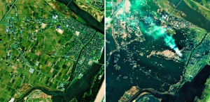 衛(wèi)星圖片顯示日本地震引發(fā)海嘯造成罕見(jiàn)災(zāi)難。左圖為2010年4月4日拍攝的日本natori地區(qū),右圖為2011年3月12日拍攝的地震海嘯襲擊過(guò)后的同一地區(qū)。
