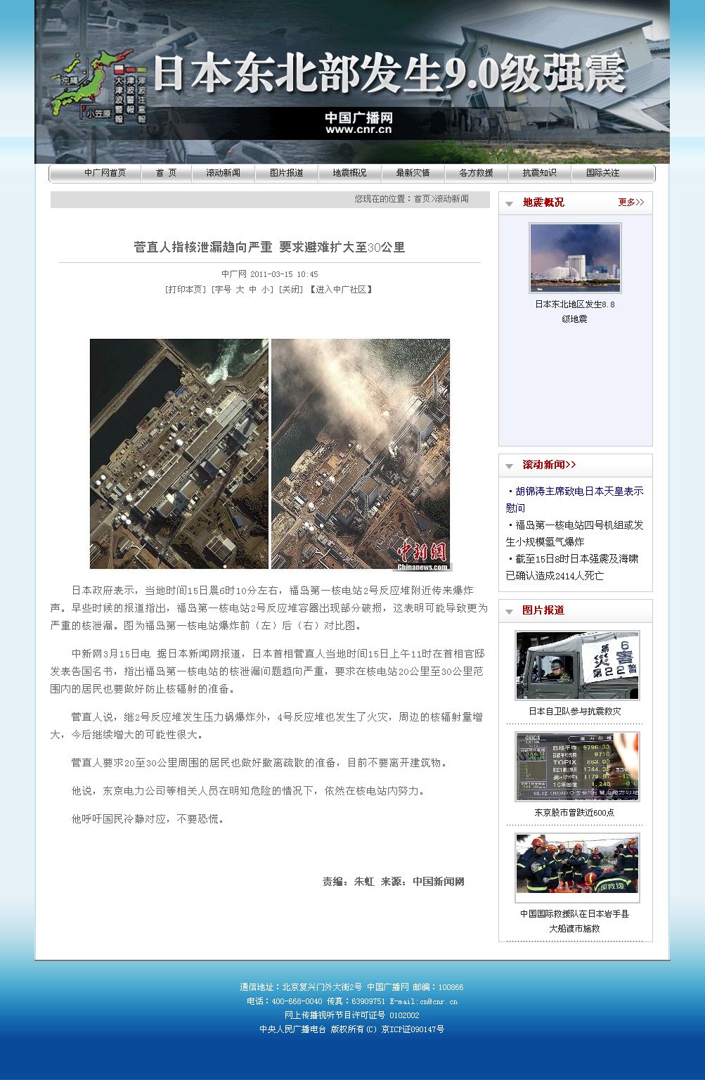 中新網(wǎng)3月15日電 據(jù)日本新聞網(wǎng)報(bào)道,日本首相菅直人當(dāng)?shù)貢r(shí)間15日上午11時(shí)在首相官邸發(fā)表告國(guó)名書(shū),指出福島第一核電站的核泄漏問(wèn)題趨向嚴(yán)重,要求在核電站20公里至30公里范圍內(nèi)的居民也要做好防止核輻射的準(zhǔn)備。