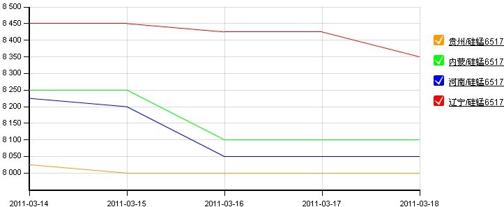 圖2:全國主要地區(qū)錳合金走勢圖(2011.3.14-2011.3.18)