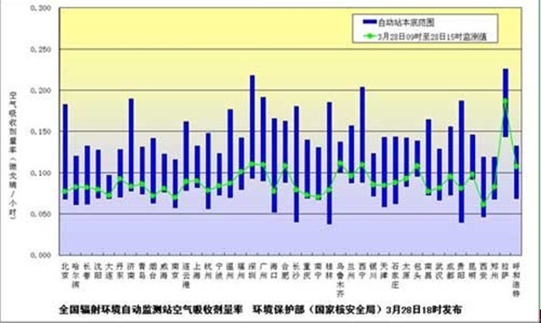 環(huán)境保護部(國家核安全局)3月28日18時繼續(xù)發(fā)布全國省會城市和部分地級市輻射環(huán)境自動監(jiān)測站實時連續(xù)空氣吸收劑量率監(jiān)測值。監(jiān)測結果表明,目前中國環(huán)境輻射水平仍在本底范圍內,日本核電事故未對中國環(huán)境及境內公眾健康產生影響。