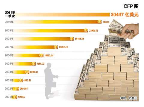 昨日,央行公布的數(shù)據(jù)顯示,我國(guó)外匯儲(chǔ)備首次超3萬(wàn)億美元。截至3月末,國(guó)家外匯儲(chǔ)備余額為30447億美元,同比增長(zhǎng)24.4%。 外匯儲(chǔ)備是指一國(guó)政府所持有的國(guó)際儲(chǔ)備資產(chǎn)中的外匯部分,即一國(guó)政府保有的以外幣表示的債權(quán)。 數(shù)據(jù)顯示,2011年第一季度國(guó)家外匯儲(chǔ)備增加了1974億美元,與2010年第四季度1990億美元的增加額相比變化不大。單月看,1月份增加844億美元,2月份增加了597億美元,3月份增加了533億美元。 數(shù)據(jù)顯示,中國(guó)黃金儲(chǔ)備持有量依舊為3389萬(wàn)盎司。