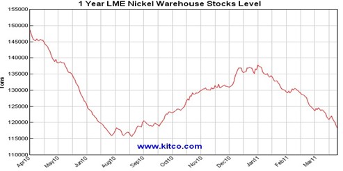 由于投產(chǎn)的新礦增加,以及舊礦重新投入正常運(yùn)營(yíng),2011年全球鎳市場(chǎng)將出現(xiàn)一定程度的供應(yīng)過(guò)剩。由于新增產(chǎn)能正常運(yùn)作需要時(shí)間,以及下游消費(fèi)需求維持在高 位,故不排除全球鎳出現(xiàn)階段性供應(yīng)缺口的可能。本周,世界金屬統(tǒng)計(jì)局公布數(shù)據(jù)顯示,2011年前兩個(gè)月全球鎳市場(chǎng)共出現(xiàn)3700噸的供應(yīng)缺口。這與今年以 來(lái)倫鎳庫(kù)存持續(xù)減少交相呼應(yīng),進(jìn)入三月份注銷(xiāo)倉(cāng)單占比一直維持在5%上方,較高時(shí)甚至增加至8%附近。根據(jù)近期國(guó)際各大鎳礦商的運(yùn)營(yíng)情況來(lái)看,整個(gè)上半年 全球鎳市場(chǎng)出現(xiàn)供應(yīng)缺口的可能較大。