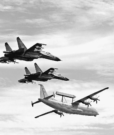 2010年初,某海域上空,預(yù)警機(jī)居中領(lǐng)航,前面殲擊機(jī)編隊(duì)陣容嚴(yán)整,后面轟炸機(jī)編隊(duì)和突擊機(jī)群緊緊跟隨。