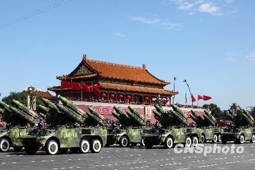 資料圖:2009年10月1日,中華人民共和國(guó)成立60周年國(guó)慶閱兵在北京舉行,防空導(dǎo)彈方隊(duì)通過天安門廣場(chǎng)。中新社發(fā)張宇 攝