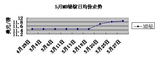 本月行情概況 自年初行情一路上揚后,3月底行情趨穩(wěn),4、5月份行情基本也基本平穩(wěn)過渡,5月中下旬行情再度企穩(wěn)回升。5月前期國內(nèi)鉍錠價格基本保持在162,000-165,000元/噸,后期行情逐漸攀升至165,000-167,000元/噸。 5月MB報價由11.2-11.7美元/磅漲到了11.4-12.3美元/磅,歐洲市場來自合金和制藥業(yè)的需求良好,成交價格突破12美元/磅