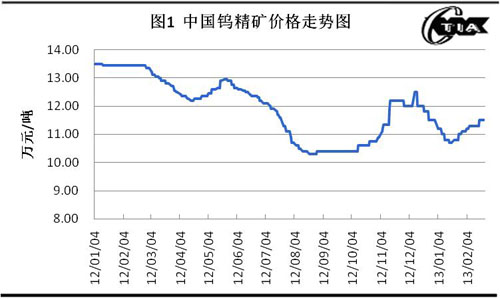 2012年下半年,鎢市場(chǎng)量?jī)r(jià)齊跌,企業(yè)開工率大幅下降,部分企業(yè)開工率不到50%,企業(yè)效益銳減。2013年1月起,國(guó)內(nèi)國(guó)際鎢市場(chǎng)開始復(fù)蘇,價(jià)格上漲、交易好轉(zhuǎn)、市場(chǎng)心態(tài)由看空轉(zhuǎn)為謹(jǐn)慎樂觀。