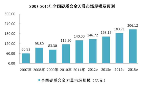目前,我國硬質(zhì)合金刀具所占的比例約為40%,遠(yuǎn)遠(yuǎn)低于工業(yè)發(fā)達(dá)國家70%的水平。若以目前硬質(zhì)合金刀具占刀具行業(yè)市場(chǎng)規(guī)模的40%預(yù)計(jì),到2015年我國硬質(zhì)合金刀具市場(chǎng)規(guī)模將達(dá)到206.12億元。我國2007-2015年硬質(zhì)合金刀具市場(chǎng)規(guī)模及預(yù)測(cè)如下圖所示: