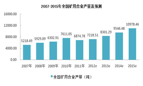 地質(zhì)勘探、礦井開采中60%-80%的鉆進(jìn)量通過硬質(zhì)合金鉆頭完成,隨著礦山品位的不斷降低和開采深度的不斷加大。我國礦用合金產(chǎn)量從07年以來一直保持著較高的增速,根據(jù)我國“十二五”規(guī)劃內(nèi)容,我國對(duì)礦用合金的消耗量將持續(xù)增加,2011年礦用合金約為6874.78噸,預(yù)計(jì)會(huì)保持在15%左右的增速,2015年礦用合金將達(dá)到10978.46噸。全國2007-2015年礦用合金產(chǎn)量及預(yù)測(cè)如下圖所示: