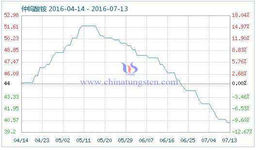 2016年7月13日仲鎢酸銨商品指數為40.35,與昨日持平,較周期內最高點100.00點(2011-09-01)下降了59.65%,較2015年11月24日最低點33.26點上漲了21.32%。(注:周期指2011-09-01至今)