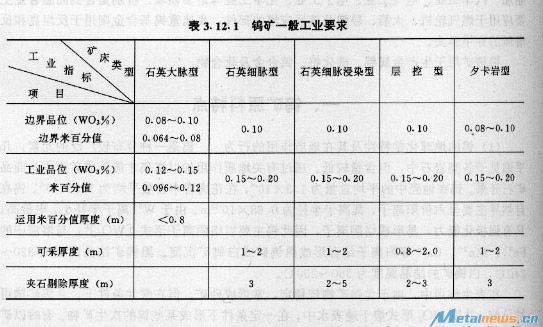鎢礦產工業(yè)要求(或稱礦產工業(yè)要求),包括礦床邊界品位(WO3%)、工業(yè)品位(WO3%)、可采厚度(m)和夾石剔除厚度(m),對各類型礦床均有不同指標(表3.12.1);典型礦床工業(yè)要求實例見表3.12.2。
