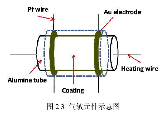 制備出納米WO3樣品后便對(duì)樣品進(jìn)行乙醇?xì)怏w氣敏性能測(cè)試,對(duì)比不同樣品的氣敏性能參數(shù)。在進(jìn)行氣敏性能測(cè)試之前,應(yīng)制取氣敏元件。氣敏元件的示意圖和實(shí)物圖如圖2.3和2.4所示,主體為一個(gè)外徑為1.2mm的空心的氧化鋁陶瓷管,陶瓷管兩端有兩個(gè)相距6mm的Au電極,兩個(gè)電極上分別連接有兩根Pt導(dǎo)電細(xì)線。在氧化鋁陶瓷管中間,穿過一條Ni-Cr合金加熱絲,可以通過對(duì)此加熱絲通電,達(dá)到加熱氧化鋁陶瓷管的目的。