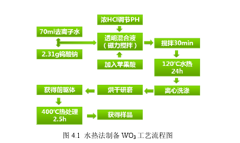 WO3前驅(qū)體的具體制備流程如下所述:分別量取70mL去離子水和稱(chēng)取2.31g鎢酸鈉(Na2W04·2H20)置于燒杯中,磁力攪拌直至完全溶解成為無(wú)色透明的溶液,然后在連續(xù)攪拌的條件下用滴管逐滴向加入濃HCl直到PH值為1.5為止,再按照DL一蘋(píng)果酸與W的摩爾為0:1,1:1和4:1的比例向溶液中加入DL-蘋(píng)果酸直至完全溶解。繼續(xù)攪拌半小時(shí),再將液體移至帶有聚四氟乙烯內(nèi)膽的高壓反應(yīng)釜中,擰緊后將其置于120℃的烘箱中保溫24小時(shí)后取出,置于空氣中自然冷卻至室溫。再取出反應(yīng)釜中所得沉淀,用無(wú)水乙醇和去離子水分別洗滌、離心三次后移至培養(yǎng)皿中在60℃的環(huán)境下烘干,最后將烘干后的粉末充分研磨,獲得WO3前驅(qū)體。 對(duì)WO3前驅(qū)體進(jìn)行XRD物相檢測(cè)、FE-SEM形貌分析以后,再將三個(gè)前驅(qū)體進(jìn)行400℃,2.5h的熱處理,最后得到無(wú)結(jié)晶水的WO3樣品。樣品的制備工藝流程圖如下圖所示: