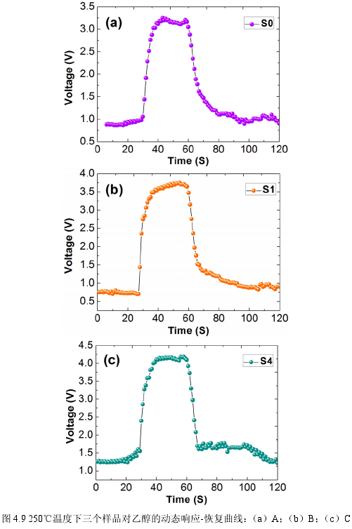 本次試驗(yàn)中對(duì)三個(gè)樣品的氣敏測(cè)試主要針對(duì)還原性氣體乙醇。眾所周知,在氣敏測(cè)試過(guò)程中,外界條件如溫度、濕度以及氣體濃度對(duì)氣敏原件的響應(yīng)有著極其重要的影響。因此,我們首先在一定氣體濃度和濕度下對(duì)三個(gè)樣品在150-400℃溫度范圍內(nèi)對(duì)乙醇?xì)怏w進(jìn)行了測(cè)試。不同溫度下S0, S1和S4對(duì)一定濃度的乙醇的響應(yīng)如圖4.8所示,從圖中可以看到,三個(gè)樣品在不同溫度下對(duì)乙醇?xì)怏w均有一定的響應(yīng),并且在150-250℃溫度范圍內(nèi),隨著溫度的升高響應(yīng)值也隨之增加,但達(dá)到250℃的最合適溫度后,當(dāng)繼續(xù)增加溫度時(shí),響應(yīng)值又開(kāi)始降低。因此,本測(cè)試中所得的氣敏元件最佳工作溫度為250℃。通過(guò)測(cè)試系統(tǒng)的計(jì)算,在250℃下,樣品S0, S1和S4的響應(yīng)值分別為12.20, 17.54和15.04,其中S1表現(xiàn)出最好的靈敏度。 在250℃時(shí),三個(gè)樣品對(duì)乙醇?xì)怏w的動(dòng)態(tài)響應(yīng)一恢復(fù)曲線如圖4.9所示,經(jīng)過(guò)氣體的引入和釋放我們可以看到,釋放后三個(gè)樣品的電阻都能基本恢復(fù)到初始電阻。同時(shí),從這個(gè)典型的呈“幾”字型響應(yīng)一恢復(fù)動(dòng)態(tài)曲線可以看到,三個(gè)樣品在250℃均對(duì)乙醇?xì)怏w表現(xiàn)出良好的響應(yīng)恢復(fù)性能。 該氣敏性能可以用目前最為廣泛的氣敏機(jī)理模型一一化學(xué)吸附、脫附模型來(lái)解釋。WO3納米材料對(duì)乙醇?xì)怏w的氣敏機(jī)理分析如第三章所述。三個(gè)樣品的氣敏性能差異主要?dú)w因于其形貌和結(jié)晶相的差異。SO主要是由不規(guī)則的納米片和納米顆粒組成,在實(shí)際應(yīng)用中,這些納米顆粒傾向于發(fā)生團(tuán)聚,嚴(yán)重影響了納米材料與檢測(cè)氣體的接觸面積。雖然納米片相互堆積容易形成氣體分子通道,但其中的納米顆粒也容易塞積在這些由納米片組成的通道,阻止表面的氣體分子向內(nèi)部擴(kuò)散。而對(duì)于S1樣品,其獨(dú)有的三維立體結(jié)構(gòu)能使樣品極不容易團(tuán)聚,另外S1中球狀結(jié)構(gòu)在燒結(jié)后聚集的納米塊變得松散,因此存在大量的空隙結(jié)構(gòu)。S4中片狀結(jié)構(gòu)上的縫隙和粗糙表面,這些都有利于其與檢測(cè)氣體的接觸和反應(yīng),從而提高靈敏度。不同的結(jié)晶相對(duì)性能也有一定的影響,可能在一定程度上,S1和S4混合的單斜和六方的混合相比SO中純的六方相更合適于與被檢測(cè)氣體反應(yīng)。而S1和S4氣敏性能差異則很可能歸因于S1的更大比表面積以及S1中更有優(yōu)勢(shì)的單斜和六方相WO3的相對(duì)含量。