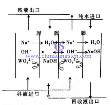 上一篇文章中我們提到利用膜電解法可脫除鎢酸鈉中的游離堿,下面我們再來看看另一種新的方法-離子交換膜擴(kuò)散滲析法。膜分離技術(shù)是當(dāng)代新型的化工分離技術(shù),與常規(guī)分離方法相比,膜過程具有能耗低、單級分離效率高、過程簡單、不污染環(huán)境等優(yōu)點(diǎn),是解決當(dāng)代能源、資源和環(huán)境問題的重要高新技術(shù),并將對21世紀(jì)的工業(yè)技術(shù)改造起著深遠(yuǎn)的影響。擴(kuò)散滲析法從粗鎢酸鈉溶液中回收游離堿的基本原理如下圖所示。