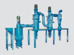HS氣流粉碎機(jī)是一種利用高速氣流來實(shí)現(xiàn)干式物料超微粉碎的設(shè)備。它由粉碎箱、截止分級(jí)機(jī)、喂料裝置、氣源系統(tǒng)、捕集系統(tǒng)等組成。物料通過喂料裝置進(jìn)入粉碎室、壓縮空氣通過特殊工藝設(shè)計(jì)的噴嘴向粉碎室高速噴射,物料在高速射流中加速,并在噴嘴交匯處反復(fù)沖擊、碰撞,達(dá)到粉碎。被粉碎的物料隨上升氣流進(jìn)入分級(jí)室,由于截止分級(jí)機(jī)的高速旋轉(zhuǎn),粒子即受到分級(jí)轉(zhuǎn)子產(chǎn)生的離心力,又受到氣流粘性作用產(chǎn)生的向心力,當(dāng)粒子受到離心力大于向心力,即分級(jí)徑以上的粗粒返回粉碎室繼續(xù)沖擊粉碎,分級(jí)徑以下的細(xì)粒子隨氣流進(jìn)入旋風(fēng)分離器,捕集器收集,氣體由引風(fēng)機(jī)排出。
