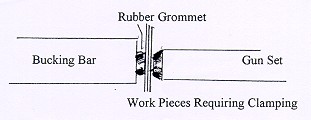 4. Pressure is held on gun while riveting. Bucking bar is held with only moderate force (otherwise rivet may be set with head proud of surface). A rubber grommet may be used over the rivet tail to assist in squeezing parts together during riveting. It acts as a 'pressure plate'