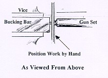 The bucking bar may be secured in a bench vice and, with the components positioned by hand, rivets are set with a gun held in the other hand. The main advantage here is that the bar is stationary and the components may be more easily held and positioned for riveting.