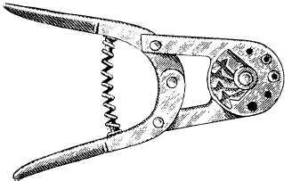Rotary Rivet Cutters In case you cannot obtain rivets of the required length, rotary rivet cutters may be used to cut longer rivets to the desired length. See figure 13-2. When you use the rotary rivet cutter, insert the rivet part way into the correct diameter hole. Place the required number of shims (shown as staggered, notched strips in the illustration) under the head and squeeze the handles. The compound action from the handles rotates the two discs in opposite directions. The rotation of the discs shears the rivet smoothly to give the correct length (as determined by the number of