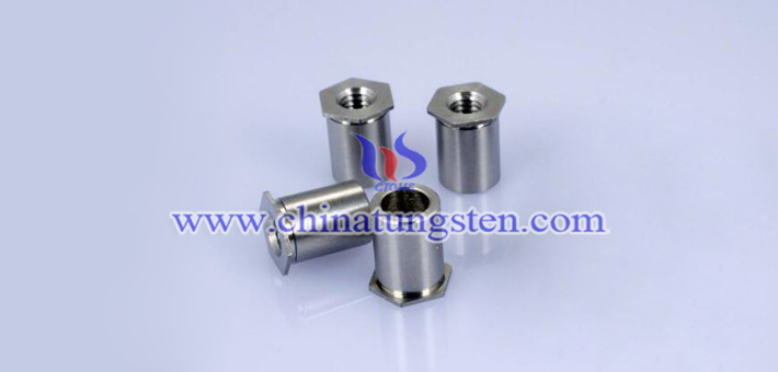 One end of tungsten alloy nut post is a hexagonal, and another end is cylindrical. There is an undercut between the hexagonal edge and the cylindrical shape, and the inner shape is internal thread. By pressing the hexagonal head into the preset hole of the sheet, plastic deformation is generated around the hole. The deformed portion is squeezed into the undercut of the nut post to be riveted to the thin plate to form an effective fixed internal thread on the thin plate.