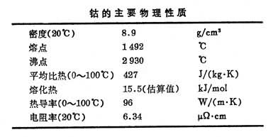 [鈷的主要物理性質(zhì)] 含鈷高溫合金在 900~1000下仍有很高的強(qiáng)度和抗蠕變性能,多用于制作噴氣發(fā)動(dòng)機(jī)的耐高溫部件。鈷能提高鐵基、鋁鎳基和稀土金屬合金的磁飽和強(qiáng)度和居里點(diǎn),使其具有高矯頑力,是電氣工業(yè)中的優(yōu)良磁性材料。鈷是硬質(zhì)合金的粘合劑。金屬部件用鈷合金涂層和表面硬化后,其機(jī)械性能顯著提高。鈷的氧化物是陶瓷制品的脫色劑和顏料;搪瓷中的含鈷釉料可使搪瓷同鋼更好地粘結(jié)在一起。鈷的有機(jī)化合物在油漆中作催干劑。鈷還在化工生產(chǎn)中用于碳?xì)浠衔锏乃�、脫硫、氧化、還原等方面 Co是γ射線源,用于物理、化學(xué)、生物研究和醫(yī)療部門。