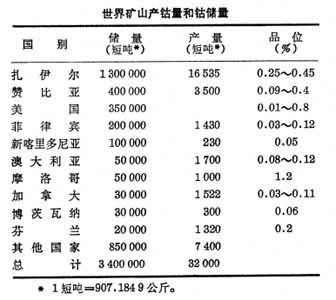 [世界礦山產(chǎn)鈷量和鈷儲(chǔ)量] 中國(guó)已探明的鈷儲(chǔ)量最大的是甘肅金川硫化鎳礦中伴生的鈷。云南的硅酸鎳礦以及四川、山東、湖北、山西、廣東等地的黃鐵礦中也含有鈷。