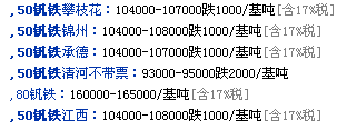 今日國內(nèi)各地區(qū)釩鐵具體價(jià)格如下: