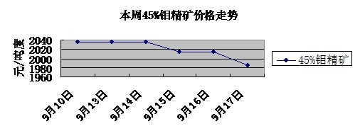 國內(nèi)市場 本周鉬市延續(xù)冷清局面,價格持續(xù)弱勢運(yùn)行,鉬鐵鉬精礦價格再次下跌,至本周末期鉬鐵價格跌至133,000-135,000元/噸,而上周五鉬鐵價格位于 134,000-136,000元/噸。鋼廠減產(chǎn)力度空前加大,使得鉬市需求持續(xù)低迷,而去年積累的庫存量以及今年前期大幅擴(kuò)產(chǎn)導(dǎo)致鉬鐵市場總體供應(yīng)過 剩,鉬主要下游市場不銹鋼庫存量也存在過剩問題,上下游基本面持續(xù)不振,鉬鐵市場偏空而行。基于鉬鐵市場相對疲弱,上游鉬精礦也受拖累一并下行,盡管礦商 低價出售意愿較低,但是隨行就市壓力使得鉬精礦也本周也再度下調(diào),當(dāng)前45%鉬精礦也降到了1,970-2,000元/噸度。